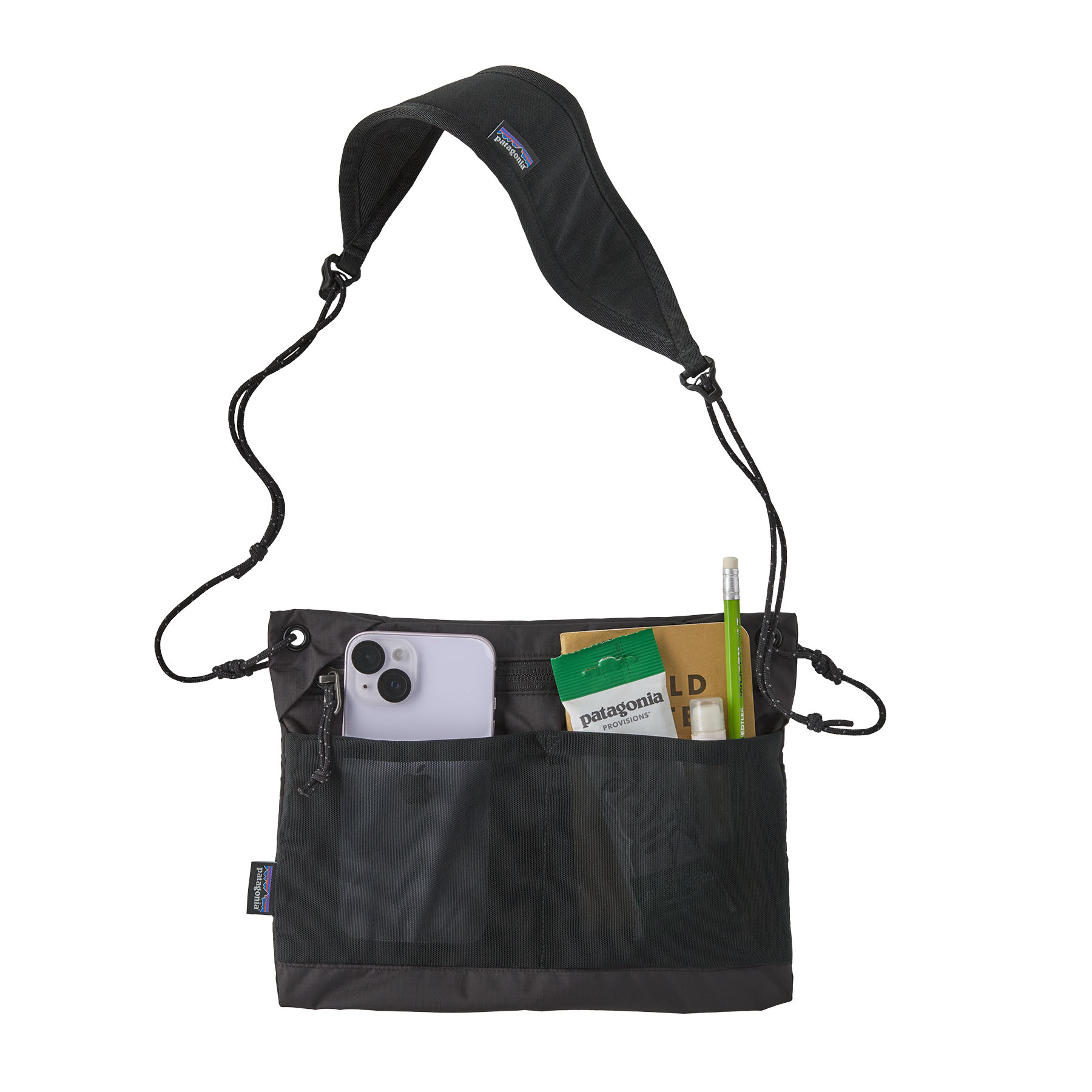 Двата предни еластични мрежести джоба подреждат дребните вещи; регулируемата презрамка осигурява комфорт през целия ден.